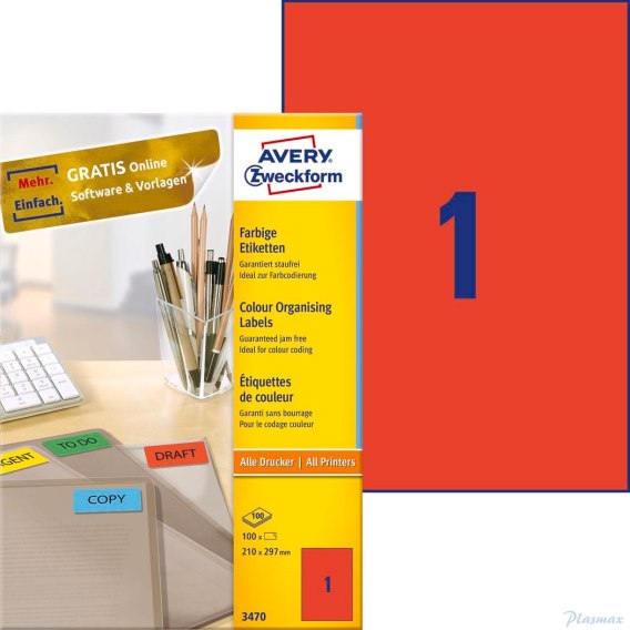 Etykiety czerwone 3470 210 x 297 100 ark. trwałe, Avery Zweckform