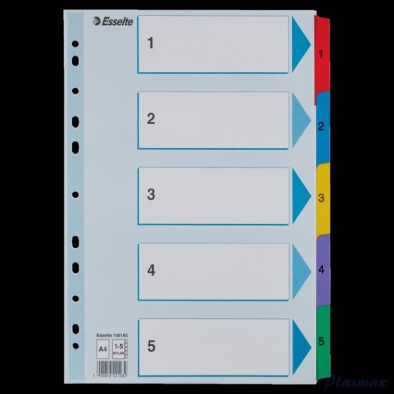 Przekładki kartonowe Mylar A4 Esselte_- do formatu A4_- z grubego, białego kartonu 160 g/m__- numeryczne i alfabetyczne_- specjalne wzmocnienie, kolorowe indeksy_- wzmocniony, perforowany pasek na karcie informacyjno- opisowej_- multiperforacja - pasuje do każdego segregatora_- z kartą informacyjno - opisową_- jednostka sprzedaży 1 komplet