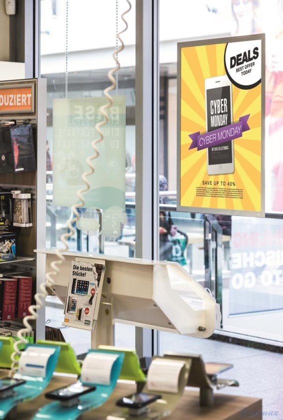 Perfekcyjna prezentacja informacji: Ramka informacyjna DURAFRAME_ POSRER przytwierdzana bez użycia kleju do powierzchni szklanych narażonych na bezpośrednie działanie promieni słonecznych. _ Profesjonalna i wysokiej jakości prezentacja informacji _ Szybkie wymiana informacji dzięki uchylnej magnetycznej ramce _ Statyczne przyleganie ramki zaprojektowanej specjalnie do powierzchni narażonej na bezpośrednie działanie słońca _ Zastosowanie: na plakaty, reklamy umieszczane na witrynach sklepowych _ Łatwe mocowanie bez efektu pęcherzyków powietrza _ Może być zdejmowana i ponownie przytwierdzana bez pozostawiania śladów na szybie _ Materiał odporny na wysoką temperaturę do 70_C _ Folia odporna na promieniowanie UV - do 2 lat _ Możliwość korzystania z obu stron, np. do 2 plakatów _ Identyczny wygląd ramki z obu stron _ Zastosowanie w pionie i w poziomie _ Wymiary zewnętrzne: 545 x 745 mm