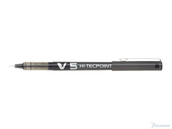 Cienkopis kulkowy z obudową w kolorze tuszu i okienkiem pozwalającym na kontrolę jego zużycia. Posiada bezpieczną wentylową skuwkę z metalowym klipem. Możliwość pisania po każdym rodzaju papieru. Polecane dla osób leworęcznych. Cienkopis V5 posiada igłową końcówkę, dzięki której linia pisania jest bardzo precyzyjna. Grubości linii pisania: 0,30 mm, długości linii pisania: 1700 m. Występuje w kolorach czarny, czerwony, niebieski, zielony._V5 produkowany jest w oparciu o technologię V-System, która obejmuje trzy filary technologiczne:_INK WRITING - Kiedy podczas pisania, ze zbiornika wydostaje się nadmiar atramentu, jest on przechowywany w specjalnie skonstruowanej końcówce z wbudowanymi mikro skrzydełkami. Dzięki temu ilość atramentu przepływającego do końcówki jest zawsze stała. Grubość pisanej linii nie zmienia się, pisze do ostatniej kropli._Hi-Tecpoint _ to niepowtarzalna końcówka wykonana ze stali nierdzewnej z zastosowaniem 3 symetrycznych wgłębień do podtrzymywania i wspierania kulki. Dzięki zastosowaniu Hi-Tecpoint, kulka podczas pisania obraca się bardzo lekko i płynnie._ATT System _ czyli system _skuwka w skuwce_. Wewnątrz zewnętrznej skuwki umieszczona jest mniejsza, która szczelnie zabezpiecza końcówkę piszącą. Dodatkowo w razie połknięcia umożliwia oddychanie._