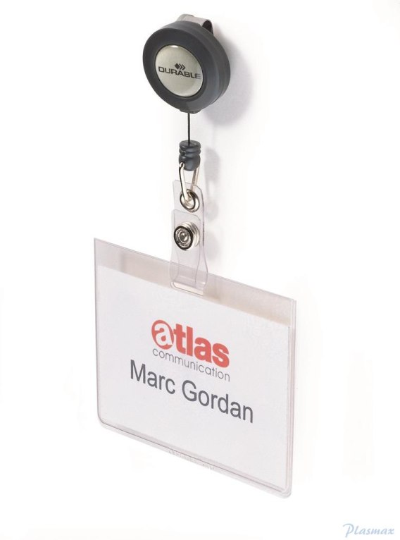 | Nazwa B2B | Identyfikator z zawieszką ściągającą o wymiarach 60x90 mm z wkładkami do zadrukowania. Możliwość wyciągania identyfikatora na odległość do 60 cm. Opakowanie 10 sztuk. Durable |