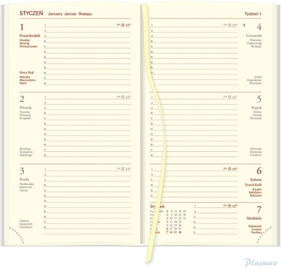- Kalendarz w oprawie Cross. Blok kalendarza szyty nićmi. Papier kremowy z perforacją narożną. Kapitałka i tasiemka żółte. Kalendarz posiada przejrzysty układ graficzny kalendarium.