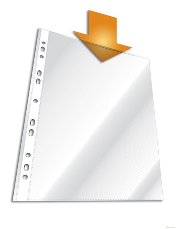 Do przechowywania niedziurkowanych dokumentów w segregatorach również z mechanizmem ringowym. Ze wzmocnioną listwą dziurkowaną. Z polipropylenu. Format A4, krystaliczna, otwierana od góry. Grubość materiału: 50 _m. Uniwersalny rozstaw dziurek. Luzem w pudełku, 100 szt.