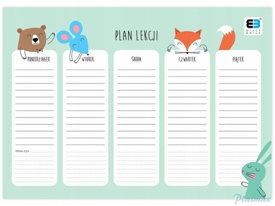 Szkolny plan lekcji z kolekcji B&B Kids Pastel ozdobiony zwierzątkami, jest niezbędnym elementem każdej wyprawki szkolnej.