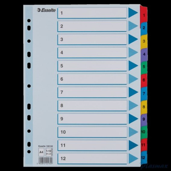 Przekładki kartonowe Mylar A4 Esselte_- do formatu A4_- z grubego, białego kartonu 160 g/m__- numeryczne i alfabetyczne_- specjalne wzmocnienie, kolorowe indeksy_- wzmocniony, perforowany pasek na karcie informacyjno- opisowej_- multiperforacja - pasuje do każdego segregatora_- z kartą informacyjno - opisową_- jednostka sprzedaży 1 komplet