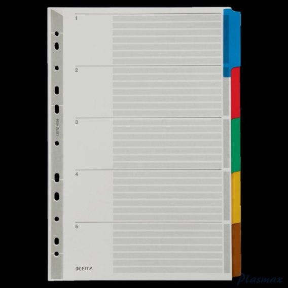 Przekładki kartonowe Leitz_- format A4 z mocnego kartonu 160 g/m__- kolorowe indeksy i perforacja wzmocniona folią_- multiperforowane - pasują do każdego segregatora_- z kartą informacyjno - opisową_- jednostka sprzedaży 1 komplet