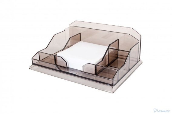 Przybornik_wielofunkcyjny__wykonany z polistyrenu__kolor: przezroczysty lub dymny__cztery przegródki oraz kostka papierowa__wymiary: 14 cm x 18,5 cm x 7 cm__jednostka sprzedaży 1 sztuka