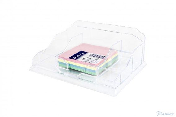 Przybornik_wielofunkcyjny__wykonany z polistyrenu__kolor: przezroczysty lub dymny__cztery przegródki oraz kostka papierowa__wymiary: 14 cm x 18,5 cm x 7 cm__jednostka sprzedaży 1 sztuka