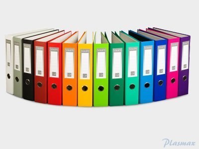Wykonany z twardej, 2 mm tektury_oklejka kolorowa, pokryta folią polipropylenową_wyklejka papierowa_mechanizm dźwigniowy z dociskiem_grzbiet o szerokości 50 lub 70 mm_oczko grzbietowe_okucia owalne_wymienna etykieta do opisu