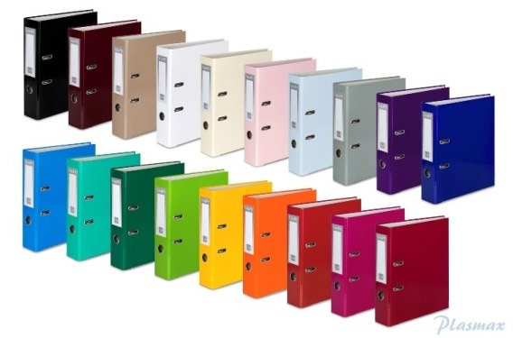 * wykonany z twardej, 2 mm tektury_* oklejka kolorowa, pokryta folią polipropylenową _* wyklejka papierowa_* mechanizm dźwigniowy z dociskiem_* grzbiet o szerokości 50 lub 75 mm_* oczko grzbietowe_* metalowe okucia dolnej krawędzi _* okucia owalne_* wymienna etykieta do opisu