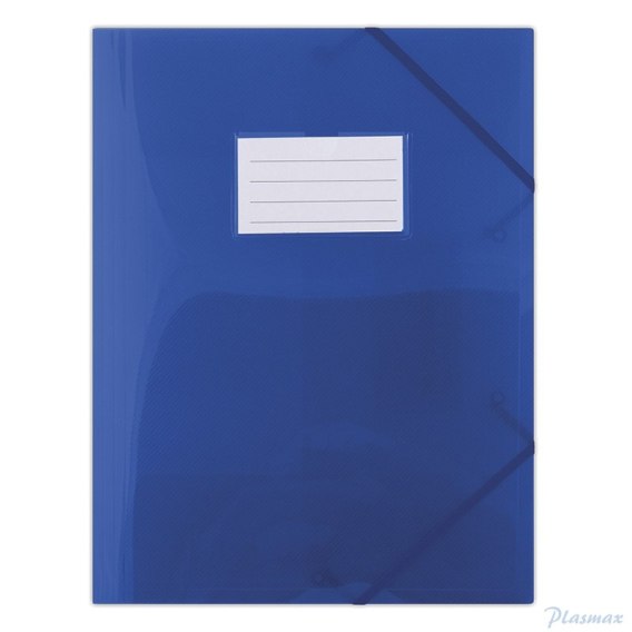 Wykonana ze sztywnego ekologicznego polipropylenu o grubości 480_m_3-skrzydłowa, półtransparentna_w delikatne prążki_zamykana za pomocą 2 płaskich, narożnych gumek w kolorze teczki z kieszonką i wymienną etykietą_rozmiar wewnętrznej kieszonki: 94x56mm_format: A4_rozmiar: 245x315mm_kolor niebieski