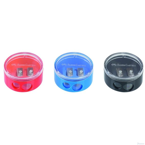 Temperówka podwójna Faber-Castell w kolorze czarnym, czerwonym i niebieskim z pojemnikiem na ostrużyny. Idealna do szkoły i biura. Przeznaczona do klasycznych i trójkątnych kredek i ołówków w standardowym rozmiarze i Jumbo. Ze śrubką zabezpieczającą.