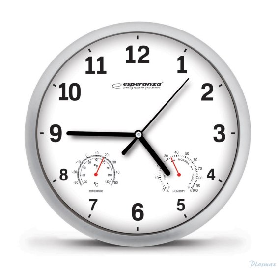Nasz zegar ścienny Esperanza LYON służy nie tylko do pokazywania czasu - można na nim odczytać też temperature oraz wilgotność otoczenia. Jego wzornictwo sprawia, iż udekorujesz nim każde mieszkanie, biuro, sklep czy restaurację.__ ___ Średnica zegara: 25 cm___ Grubość zegara: 3,6 cm___ Rama zegara z wysokiej jakości tworzywa sztucznego___ Tarcza zegara ze specjalnego artystycznego papieru___ Cichy i bardzo precyzyjny mechanizm kwarcowy___ Zakres mierzonej temperatury: -30 _C _ + 50 _C (-30 _F _ 110 _F)___ Zakres pomiaru wilgotności: 0 _ 100%___ Hak do motażu na ścianie w zestawie___ Zasilanie: 1 x bateria 1,5V AA (niezałączona)